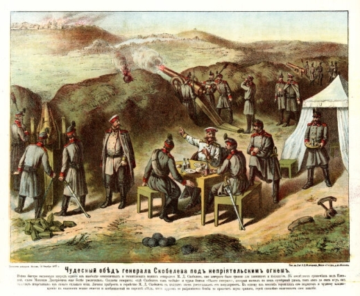 Я думаю, картинка навеяна следующими событиями. Читаем в книге П. А. Дукмасова "Со Скобелевым в огне", глава III: