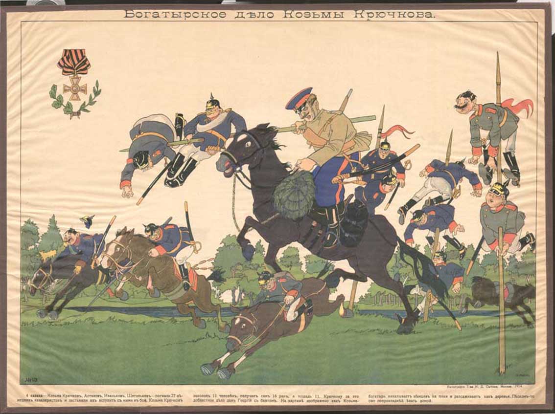 Подвиг Козьмы Крючкова зафиксирован документально.Согласно официальным отчетам и наградным документам, Крючков лично зарубил и заколол пикой 11 чел. И есть на эту тему картинки вполне реалистического свойства, без нанизывания германцев на пики, как на шампуры.