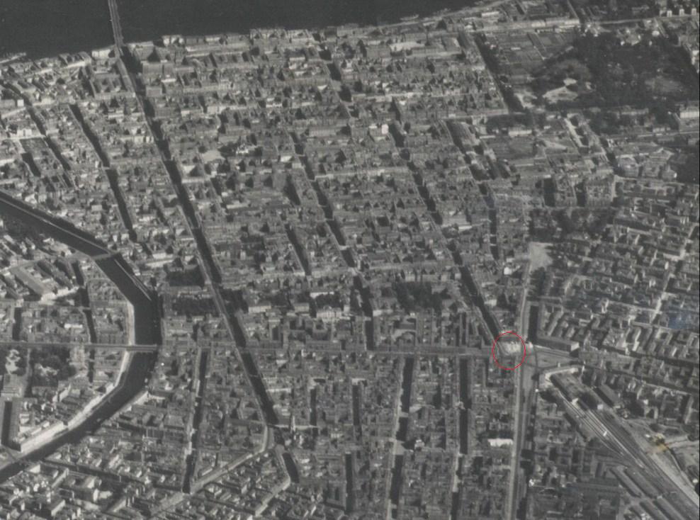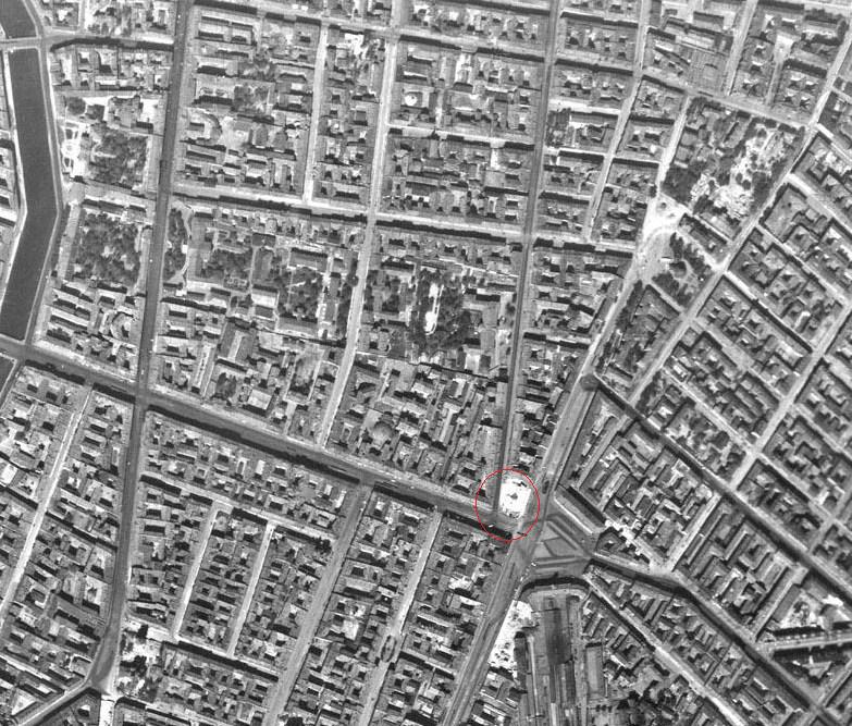 Но вот ещё что интересно. Утверждается, что Знаменская церковь, по разным данным, была разобрана то ли в 1940, то ли в начале 1941 г. В то же время, оказывается, в 1940 г. рассматривалась возможность реконструкци церкви под здание Ленпромстройпроекта. И м.б. к ней и приступили, во всяком случае, на известной немецкой АФС от 26.06.1941 довольно отчётливо видны сохранившиеся части здания церкви - то ли разбираемые, то ли перестраиваемые.