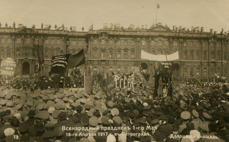 Недавно приобрел открытку, на которой изображена Первомайская демонстрация, проходившая 18 апреля 1917 года по всему центру Петрограда. Есть целая серия открыток, посвященных этому событию. На представленной открытке запечатлена толпа народа на Дворцовой площади. На трибуне стоят двое и, кажется, общаются или о чем-то спорят. Могут ли это быть какие-нибудь известные исторические личности? Кто сможет опознать этих революционеров?