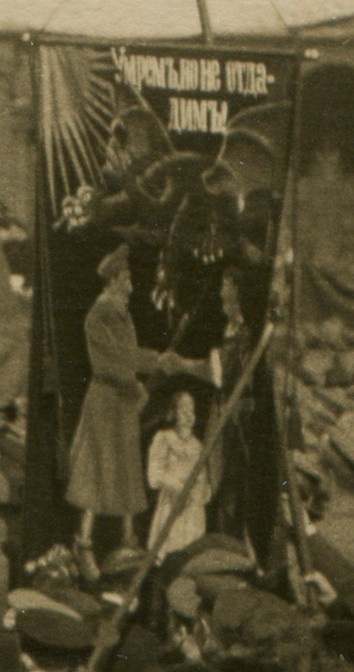 На крайнем лозунге слева написано: "Берегите юную свободу", на лозунге над трибуной: "Жизнь за свободу угнетенных народов", рядом с транспорантом "Егеря" можно прочитать только урывками: "Единен..., сего...", на транспоранте справа изображен солдат, ангел и еще кто-то, над ними - дракон, еще выше надпись: "Умрем, но не отдадим!"