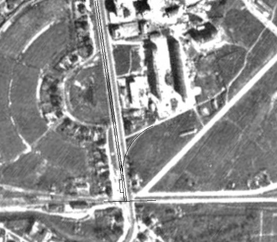 Заинтересовавшись, я первым делом полез смотреть аэрофотосъемку 1939 года, и - сразу удача: на снимке августа 1939 года где отчетливо, где пунктиром видно недостроенную трассу: