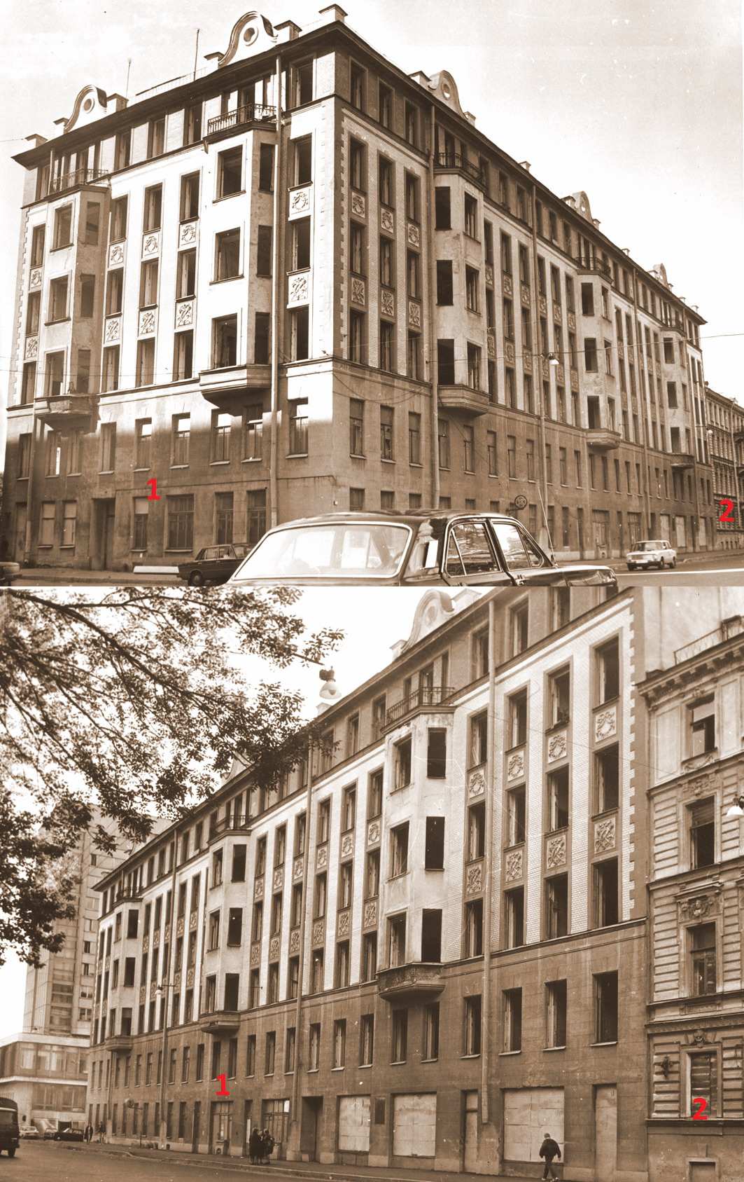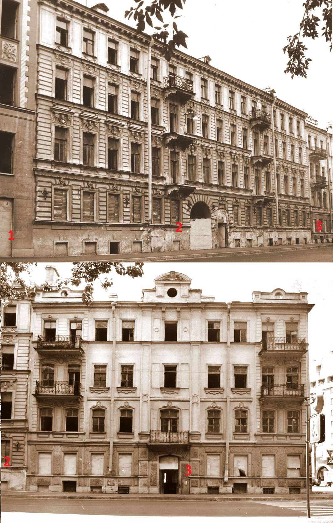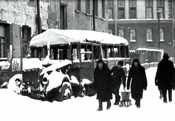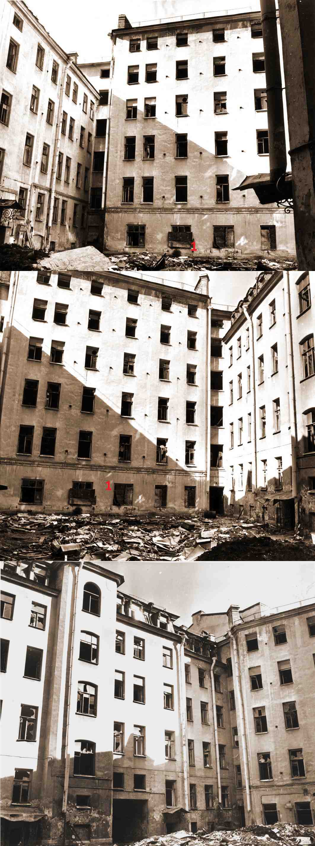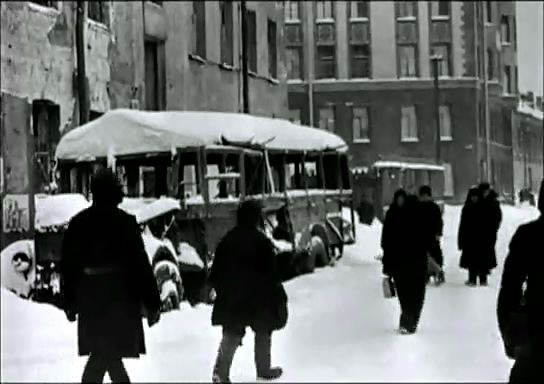 На самых первых кадрах "клипа" хорошо видна стена дома (1), обращенная на юг, на Клиническую улицу (с двумя эркерами). Предыдущие кадры сняты возле угла Большого пр. П.С. и Пионерской ул., последующие — вероятно, на Нижегородской ул. (Академика Лебедева) и около Литейного моста (на них несомненно запечатлены эвакуирующиеся со своими пожитками, идущие к Финляндскому вокзалу). Последнее указывает на примерное время съемки — март 1942 г., когда эвакуация по Дороге жизни приобрела наиболее массовый характер.