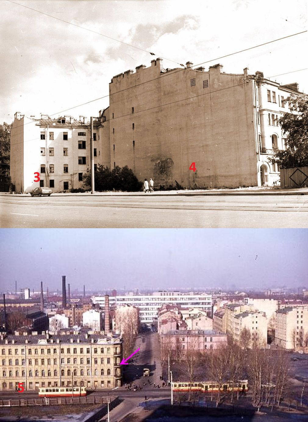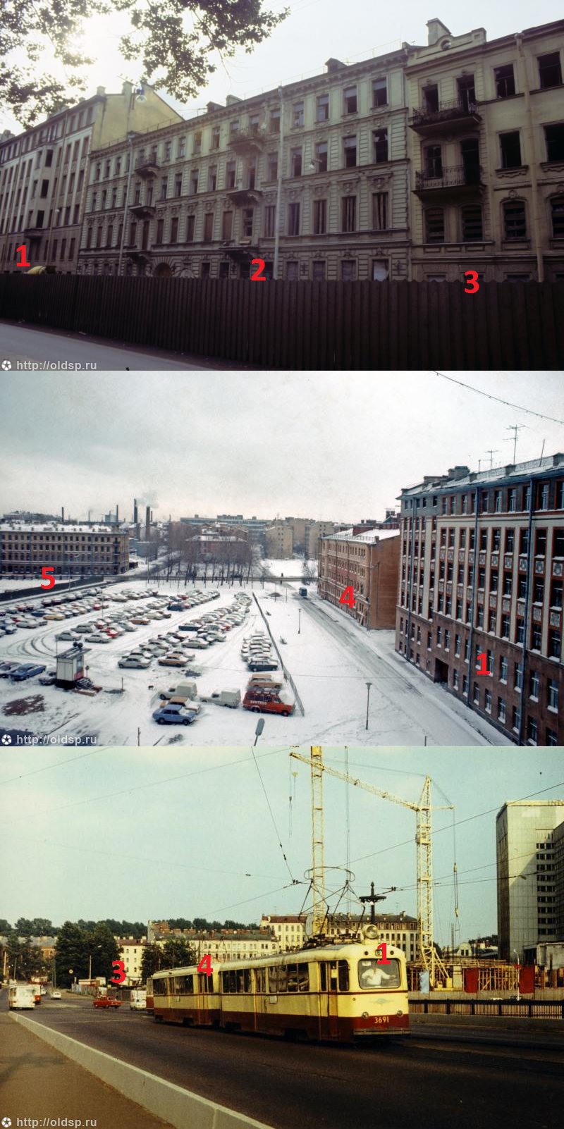 Какая-то у вас слишком сложная дискуссия... Автобус несомненно стоит на северной стороне ныне не существующей части Клинической улицы, в полутора кварталах западнее пр. К. Маркса (Б. Сампсониевского). За автобусом налево, на север, уходит Саратовская улица — это самое ее начало. Заборчик там вполне характерный, и просматривается даже на космоснимке. Тупой угол дома (1), со стенами, выходящими на Клиническую и Саратовскую улицы, — тоже вполне узнаваемый.