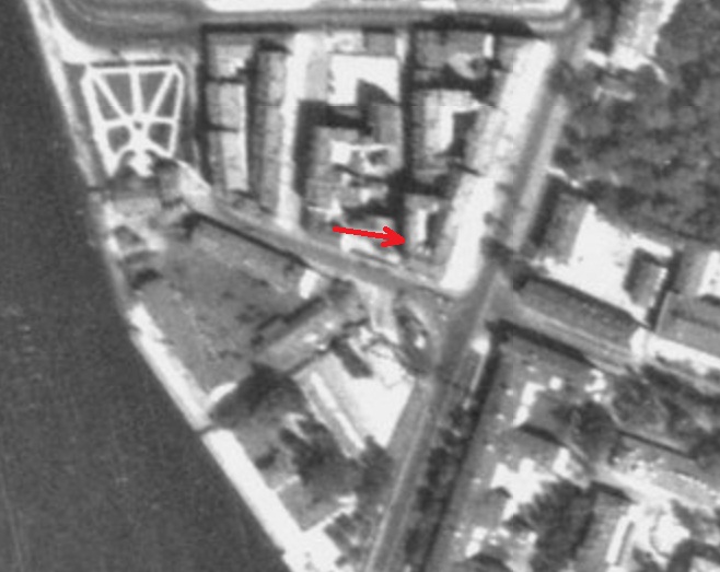 Уважаемый Бегемот, посудите сами, непосредственным продолжением дома за автобусом служит забор, далее линия этого забора аккуратно продолжается фасадом дома (1) - тем фасадом, который чуть видно в правой части кадра. Меня немного смущает слишком большой просвет между домами - на АФС он очень маленький - возможно, за забором остатки разрушенного дома? А желтая стрелка не совсем вдоль Клинической, а чуть под углом.