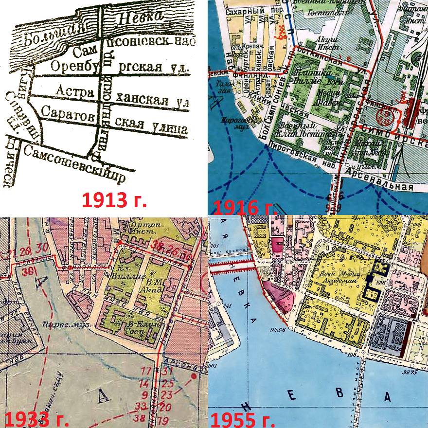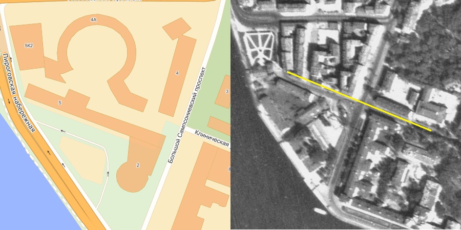 Что любопытно, после строительства гостиницы Ленинград западная часть Клинической улицы сохранялась в виде проезда вдоль северного фасада гостиницы. Самое интересное, что она продолжает существовать и сейчас в виде просвета (а, может быть, и проезда) между гостиницей и Петровским фортом. Этот просвет не составляет прямую линию с нынешней Клинической улицей - но и раньше прямой линии не было, отрезок Клинической ул. западнее Б. Сампсониевского был чуть сдвинут на юг относительно восточного отрезка этой улицы, что хорошо видно на АФС.