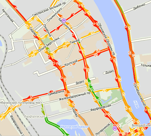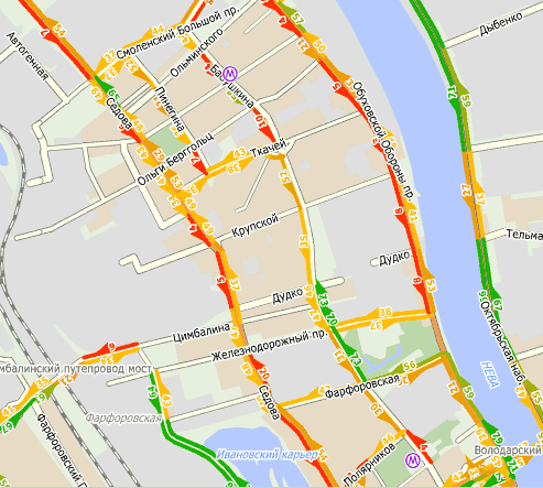 | Цитата: | Скорость движения потока низкая только на пр. Обуховской Обороны перед Володарским мостом, на ул. Седова и ул. Бабушкина перед Ивановской ул. и перед Цимбалинским мостом.
