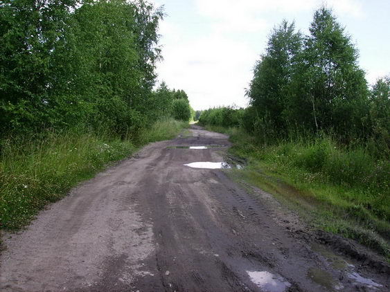 Дорога так себе. Обещанной красивости может и больше, чем на пыльном грейдере, но смотреть на нее особо некогда. Полоса выбоин и луж может начаться внезапно. А леса вокруг достаточно мрачноватые (по сделанным фоткам не видно). Елово-березовые. Они вплотную подступают к полотну дороги.