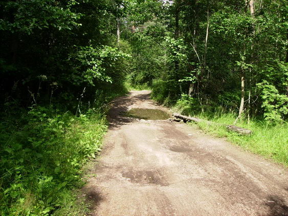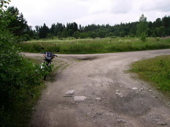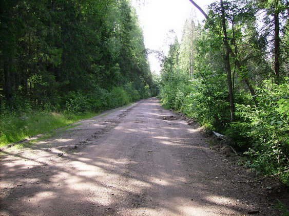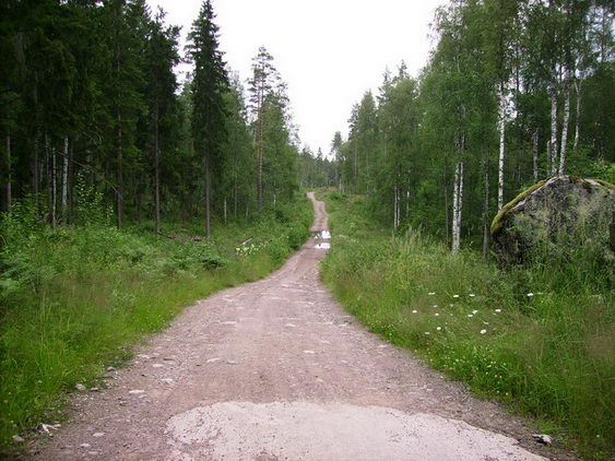 Я ехал не в самое дождливое время. Не засуха конечно, но и не каждый день дождь. Однако практически во всех более-менее приличных ямах вода. Хорошо хоть у половины больших луж остались с боков сухие, сантиметров по 30, берега. Это позволило объезжать их на двух колесах посуху. Зачастую не снижая скорости. С лужами от края и до края – сложнее. Какова глубина и какое дно - неизвестно. Вполне можно влупиться в выпирающий, но невидимый в мутной воде, валун. Или просто нырнуть в бездонную лужу. Приходилось сбрасывать скорость до минимума, и потихоньку проезжать по краешку. Экстремалы могут конечно и не тормозить, но мне себя и коника жалко. К чести финнов, можно сказать, что почти вся дорога достаточно твердая – песчано-каменистая. Это и есть наверно то самое «усовершенствованное покрытие». Цитата: «На карте от уважаемого "ЗАО Карта ЛТД" она показана как дорога с усовершенствованным покрытием. Наверно ее последний раз усовершенстовали финны летом 1939 года». Действительно, на местности все очень похоже на правду. Местами ямы такие, что вообразив их заполненными водой, становится как-то не по себе. Легковушка в них утонет, к примеру, по форточки. А еще на дороге встречаются «лежачие полицейские». Это старые бетонные трубы, положенные неизвестно кем. Время и природа местами выперла их из полотна дороги на треть диаметра.