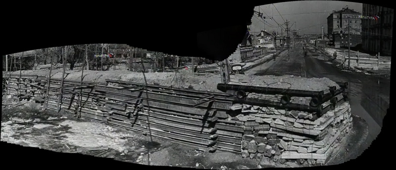 Слева виден участок, на котором сейчас стоит дом Стачек 67. Скверик (слева на кадре), через который проходит баррикада сохранился до сих пор.