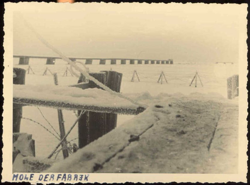 Минувшей зимой я подобрался к ее остаткам по льду. Очевидно, это ее конец, на аэрофотоснимке он имеет вид буквы "Г". Конструкция чисто утилитарного вида, сильно потрепана временем и погодой.