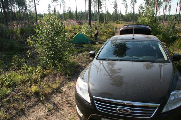 Часов в 5 решили поспать. Целились в несколько съездов, но понравился лишь один — уводящий на вырубку. Съехали с дороги, поставили машину в низинке — чтоб финские товарищи с трассы не видели. Конечно , пишут , что в Финляндии свобода перемещения и кемперский рай, но общение с усердными полицейскими не входило в наш проработанный суперплан. Поставили палатки и дали храпака. Проснулись в 9 — солнце начало ощутимо печь..