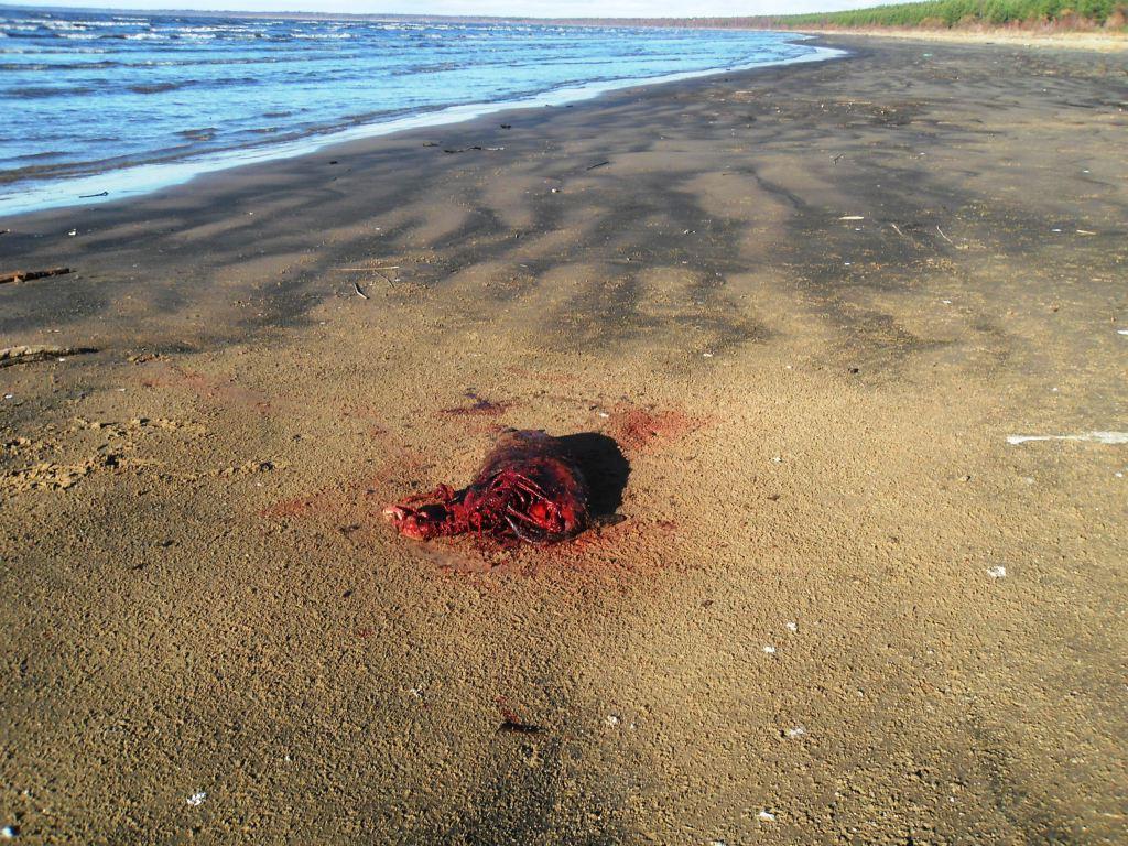 Над погибшей нерпой, выброшенной штормом пока "поработали" только орланы и вороны.