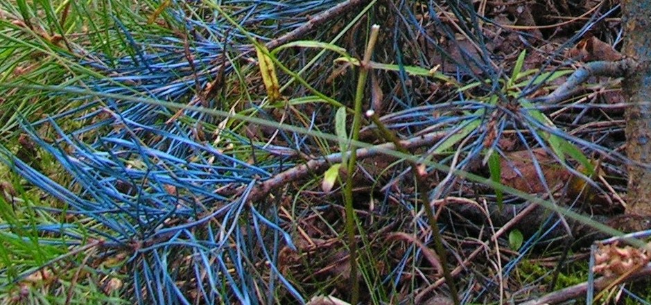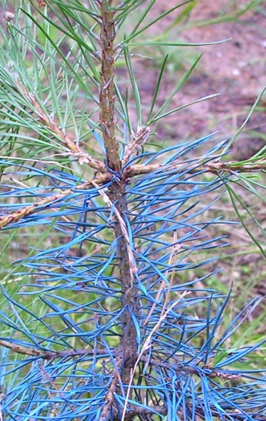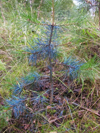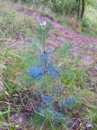 Кора на сосёнке тоже с синими следами была,но не сплошняком,а пятнами неровными,как будто,если красили сначала целиком все,то потом с ростом деревца синева расходилась.А снимал уж года четыре назад; потом,на следующий год специально заезжал с проверкой-деревце было полность зеленым и здоровым,никаких следов синевы не было.К сожалению,еще на следующий раз сосёнки уже не нашел,то ли плохо искал,то ли погибло.А,может,эксклюзив пристроил кто.