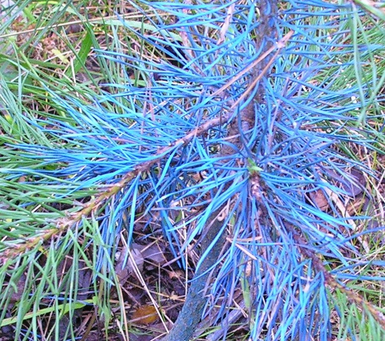 А вот какая сосёнка попалась на южном берегу Финского залива.Часть иголок радикально синего цвета.Никаких следов краски нет,все выглядит так,будто иголки уже выросли синими,при этом они выглядят совершенно здоровыми (некоторые попадали на землю).Единственное,что приходит в голову- зимой (при снежном покрове на земле) опрыскали крайне аккуратно краской малышку целиком,а весной и летом новые иголки наросли уже зелеными.Но почему при этом покрашенные иголки не погибли? (сжать картинку слабее не выходит,а вся не лезет,извиняюсь за размер).