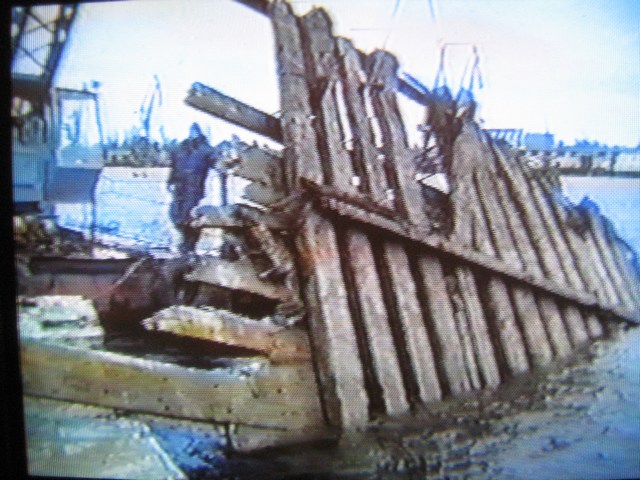 Заранее прошу извинить за качество фото- фотоаппарата тогда не было, запись была сделана на видеокамеру, предлагаемые фото- переснято с экрана телевизора. Суть в следующем: весьма похожие по конструкции обломки судна извлекали из-под воды в устье Малой Невы в 2005году при производстве дноуглубления. Собрано все без металлического крепежа, на деревянных шипах. При подъеме разваливалось кусками.