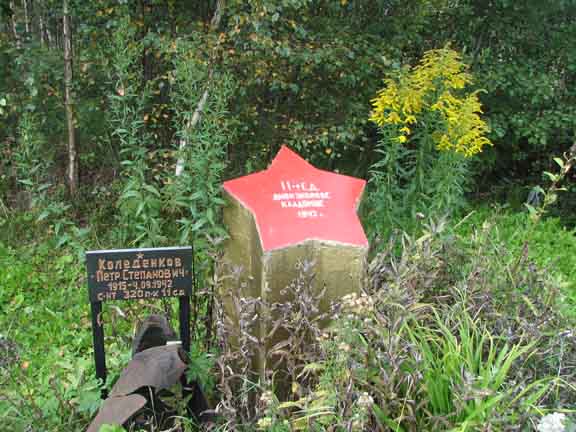 Рядом с предыдущим памятником, но с другой стороны дороги — остатки советского ЖБОТа, а чуть далее — еще одна братская могила на 5 человек. В 2008-м году я увидел здесь деревянный намогильный крест, но в 2009-м его заменили на красную пирамидку, крест же, как обычно, отставили в сторону:
