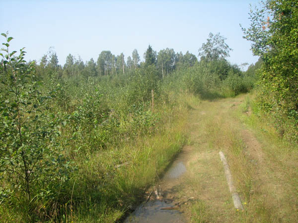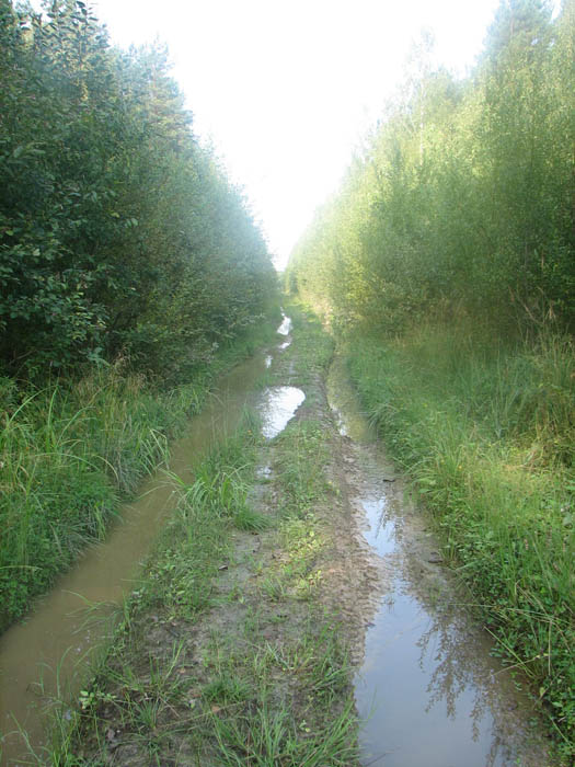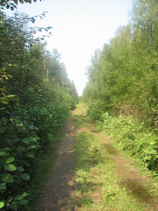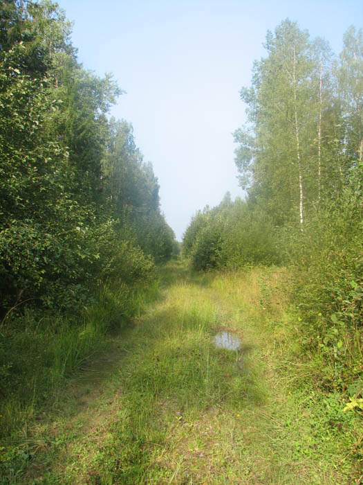будет развилка. Пропустить ее трудно, так как это будет единственный случай, когда налево пойдет дорога примерно того же качества. Сворачиваем налево и вскоре вновь оказываемся на насыпи УЖД, которую легко узнать по прямой, как стрела, просеке. Дорога остается очень симпатичной по качеству: