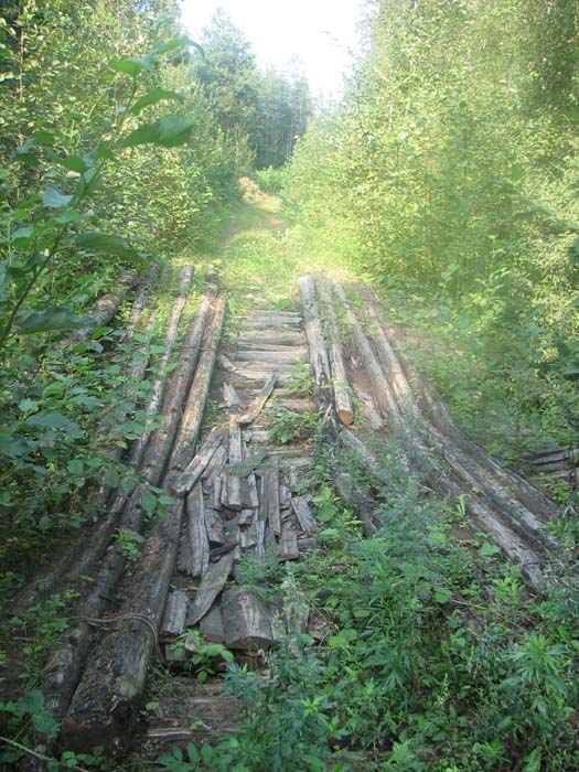 Вероятно, эти остатки моста считаются непреодолимым препятствием для легковых автомобилей, потому что машины грибников и ягодников дальше не идут. В грибной сезон несколько таких машин можно увидеть припаркованными у этого моста. Хотя для "джипов" типа "Нивы" и других он, на мой вскус, проходим.
