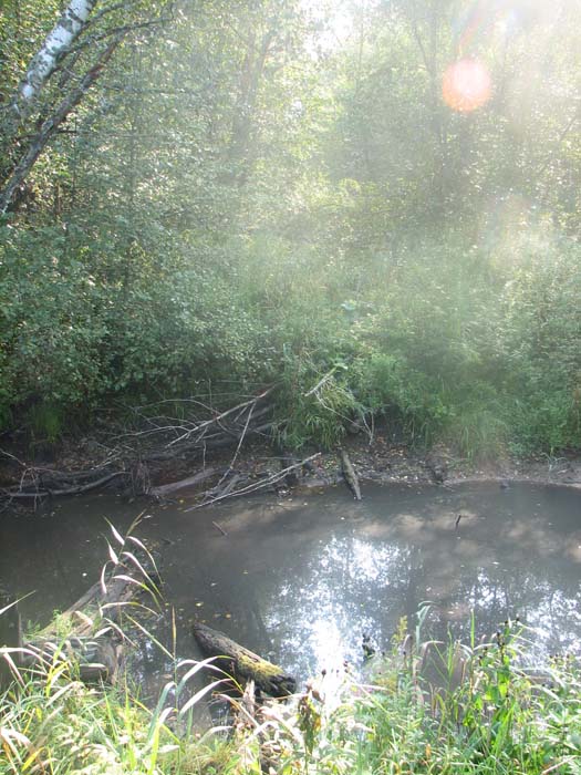 Еще одной задачей, которую я себе поставил, была проверка дороги от Малуксы на Березовку, Белоголово и далее в Шапки. На военных картах она есть. До Березовки от Малуксы я добрался без особого труда, хотя поворот у Малуксы выглядит несколько иначе, чем показано на карте. В Березовке, кстати, до войны сельсовет был. Я спросил у местной дачницы дорогу на Белоголово, и она примерно сказала, где в деревне повернуть направо. На уточняющий вопрос, можно ли вообще по ней проехать, меня порадовали ответом, что туда как-то уехал велосипедист, и не вернулся. В общем, поворот на Белоголово нашелся без проблем, и я въехал под своды леса близ берега ручья Березовка. Но дорога... Грязь была такая, как будто на ней недавно резвилось стадо "Камазов". Учитывая, что дорога километра четыре идет вдоль берега речки Березовки, то есть по заболоченной низине, шансы встретить менее полноводные (или, скорее, полногрязные) участки дороги растаяли, как дым. Кроме того, в конце этих 4 километров меня ждала переправа через реку Мгу, которая на одном листе атласа была помечена как мост, а на другом, смежном листе, как брод! А если это непроезжий брод, мне что, плыть обратно эти четыре километра?! Таким образом, проверку дороги пришлось отложить, до разведки с противоположного ее конца на предмет переправы через Мгу. (Забегая вперед, скажу, что там оказался глубоководный брод, но в сотне метров ниже по течению обнаружились бревна, переброшенные через реку.)