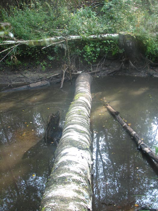 В этом районе через русло реки, течение которой почти незаметно, переброшено несколько одиночных сваленных деревьев,