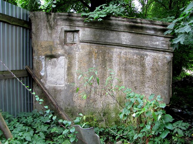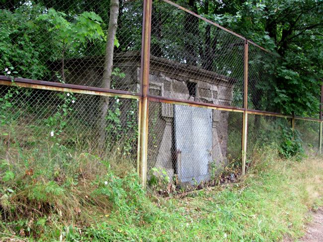 Там же с тыльной стороны. Похоже, что и сейчас используется по назначению, но на стене остались изоляторы и крюки под 3 фазы и ноль. Рубильник (Вероятно не единственный) на высоте около 4 м, как его переключали - не понятною И где у него защита от непогоды?