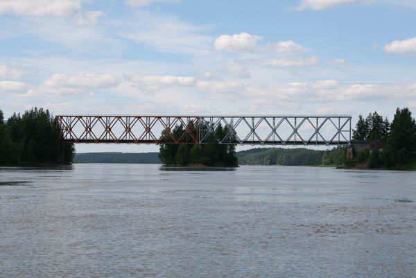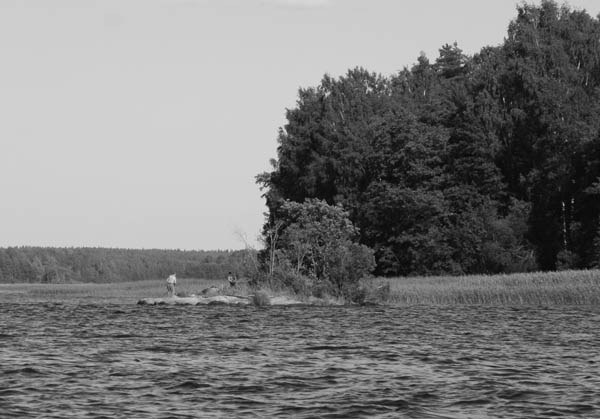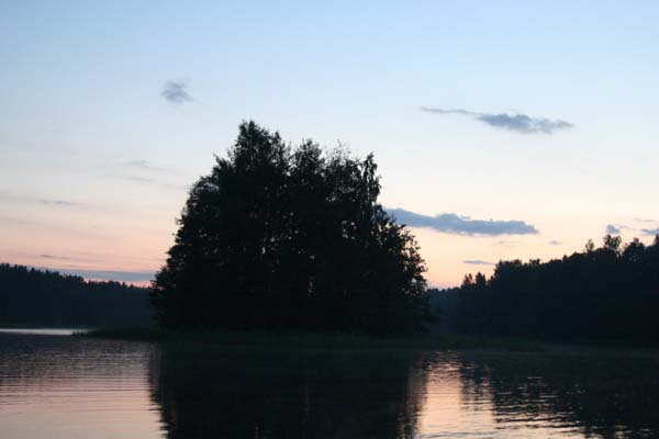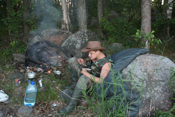 В планах не было перемещаться в прошлое как в фильмах , поэтому пошли дальше. Под мостом около п. Дружное пришлось вылезти на берег и тащить лодку как бурлаки – против течения было трудно грести. Вышли в Вуоксу Вирту и помчали к Вуоксе. Все интересующие нас места были заняты лагерями туристов, поэтому не высаживались. Где встать для отдыха тоже не просто было найти . Около 5 часов все-таки удалось найти свободное место чуть выше Колокольцево и мы встали лагерем. Поели , завалились спать.