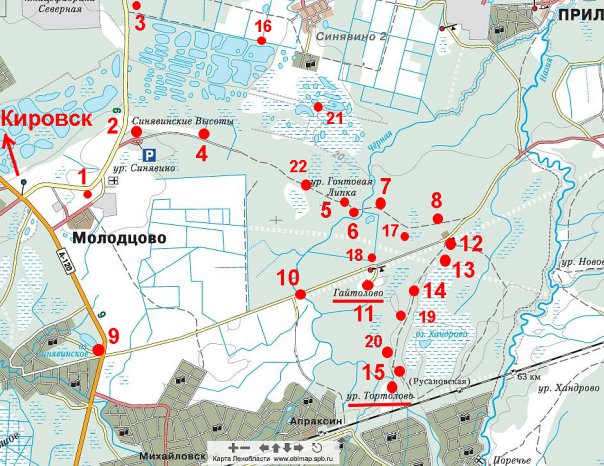 Примечание. Во время войны дороги А-120 не существовало. На месте дороги от Синявино на север (мимо номеров 1, 2 и 3) шла узкоколейка от Мги на Шлиссельбург. Дорога 1-2-4-5-6-7-8 и далее — это старый Архангелогородский (Мурманский, Вологодский) тракт. Дорога 9-10-12 — техническая дорога Келколово–Путилово, появилась незадолго до войны вдоль ЛЭП от Волховской ГЭС на Ленинград. На месте Молодцово был свх. Торфяник. На месте Апраксина — пос. 1-й Эстонский. На месте п.г.т. Синявино-2 — Рабочий поселок №8. Поселок Приладожский, садоводства (оливковым цветом) и птицефабрики появились после войны.