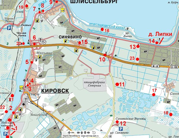 Также схема (моя): "Памятники и памятные места в полосе наступления Ленинградского фронта (район г.г. Кировск, Шлиссельбург)":