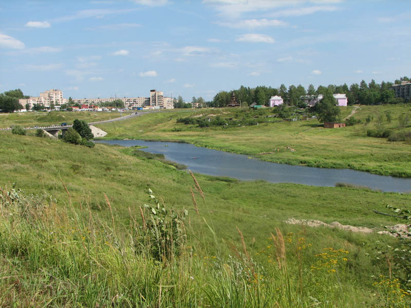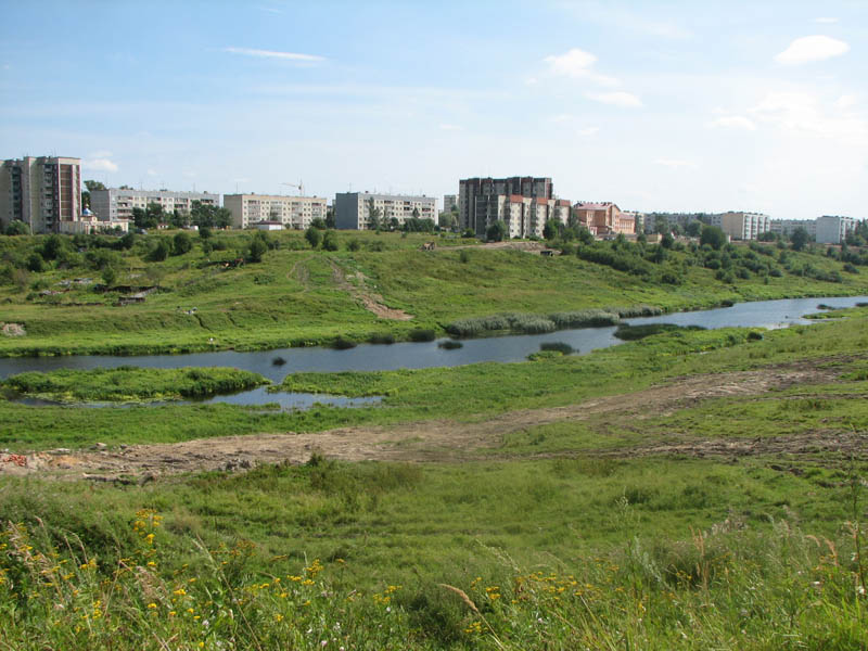 Почти от этого места открываются красивые пейзажи на излучины реки Тосны и белеющие городские новостройки на правом ее берегу: