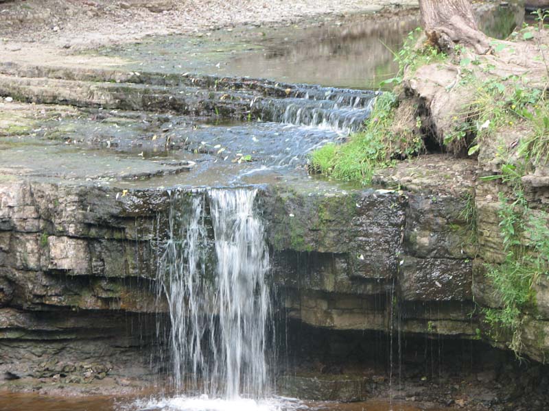 Обещанной одной велопокатушкой красивой смотровой площадки у кладбища я не нашел, и через мост въехал в Ульяновку (Саблино). Только не ждите от меня отчета о знаменитых Саблинских пещерах! Был я там, был, в начале 1980-х, когда еще не существовало никакой платно-экскурсионной инфраструктуры: мы как-то прогулялись ныне засыпанным ходом из "Жемчужной" в "Штаны" и немного по последним — с нитками еще ходили. Пещеры, право! стоят отдельного рассказа, а мои запросы на сегодня были куда скромнее — посетить оба водопада. Почему я и свернул за мостом на Советский проспект. К водопаду на речке Саблинке надо поворачивать по 5-й улице, если хочешь ехать по асфальту, но я не утерпел, и свернул по 8-й улице, благо там был пешеходный мостик. Мостик, кстати, оказался расположенным низко и с крутыми большими лестницами, так что для велосипедистов я его не рекомендую. За речкой попадаешь на место бывшей деревни Александровка (Козловка), откуда дорогу к водопаду указует информационный щит. Метров 250 по грунтовой дорожке вправо — и вот он, Саблинский (малый) водопад: