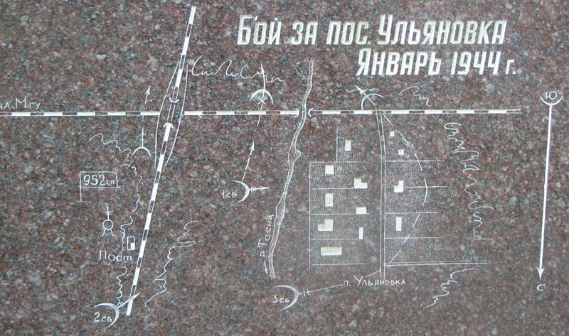(С рекой, очевидно, напутали — на схеме не Тосна, а Саблинка.) Здесь же похоронен Герой Советского Союза красноармеец Л. Я. Тупицын, совершивший в бою за Ульяновку подвиг Александра Матросова.