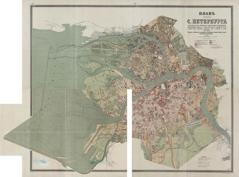 План города С. Петербурга с показанием улиц, набережных, площадей и проч. с присвоенными наименованиями, начиная с 7 марта 1880 г. по 1 сентября 1904 г., а также всех городских имуществ, вод и отмелей в устье реки Невы - Санкт-Петербург, [1904]. - 4 л. Литография.; 54х67