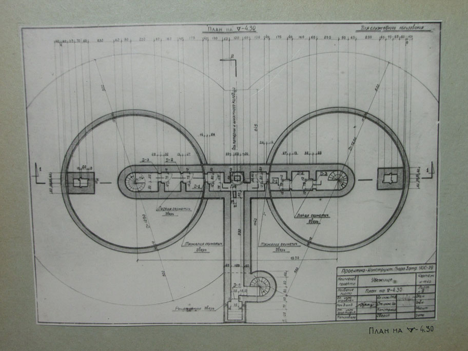 Командный пункт состоял из полутора десятков оригинальных железобетонных сооружений подземного типа, выполненных в виде глубоких цилиндрических опускных колодцев диаметром 13 метров с мощными защитными «тюфяками» толщиной более 3 метров. Внутри [77] железобетонного стакана (толщина стенок — пол» метра) радиальные железобетонные перегородки создавали рабочие помещения, в центре стакана монтировалась металлическая винтовая лестница. Все сооружения соединялись подземными ходами сообщения. Была произведена мощная многослойная оклеечная гидроизоляция и осуществлен дренаж сооружений. Уникальный объект в сложных гидрогеологических условиях был построен и полностью оборудован за 7 месяцев."