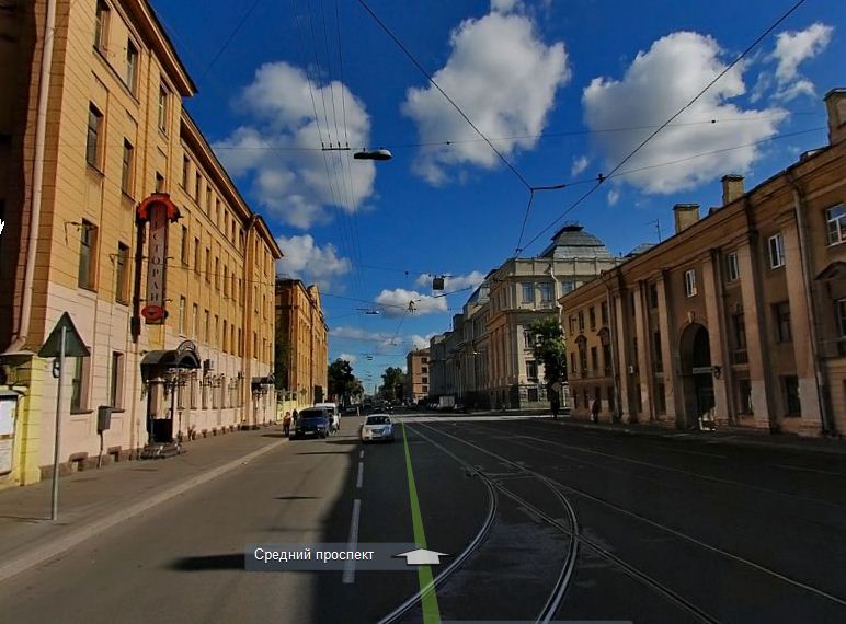 Это точно Средний проспект В.О. Красивое большое здание справа (на современном снимке)- это ВСЕГЕИ (ВСЕроссийский ГЕологический Институт, (Средний, 74). Построено если не ошибаюсь году в 1914. На старом снимке его ЕЩЁ нет. Зато хорошо видны дома 18-й линии. Невысокое здание слева за деревьями это угол 18-й и Среднего; оно и сечас существует. 3-х этажный мрачноватых тонов дом на правой стороне Среднего реконструирован в конце 60-х годов; было надстроено ещё два этажа; кроме того при реконструкции он несколько разросся в плане и вобрал в себя дом справа. Сейчас это Средний, 72. В нём располагается типография указанного выше института. Красивый светлый дом чуть правее по линии существует до сих пор. В советские времена он принадлежал заводу "Пневматик".