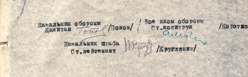 КП обороны-штаб 620 с.п.-начальник обороны Капитан Попов,Комиссар обороны-бат.комиссар Лисунков.Начальник штаба обороны-Ст.лейтен.Вержбицкий,Пом.нач.штаба-ст.лейт.Круглянин и мл.лейт.Мухин. С 24.2 комиссар обороны ст.политрук Коротков(политотдел 18 с.д.),Нач.штаба ст.лейтенант Круглянин. Гарнизон имел внутреннюю телефоннуюсвязь и шесть точек до 1.3.40г.,связь по радио поддерживалась до 2.3.40г. с 56 с.п.(скорее всего опечатка-с 56 с.к.) На наши запросы главным образом о