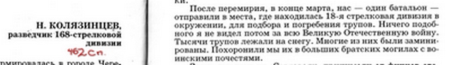 по 10-15 трупов. Закопаем, ставим столбик, прибьем дощечку с номером могилы и количеством трупов и ни имен, ни фамилий и никаких почестей. Сколько мы так закопали, не скажу, потому что точно не знаю, но полагаю, что наш взвод похоронил не одну сотню. А убитых лошадей мы обливали бензином и сжигали», — (Михайлов Н. П., красноармеец, 37 стрелковая дивизия).