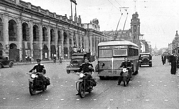 Специальная группа инспекторов Управления городской милиции для поддержания образцового порядка в движении транспорта патрулирует на скоростных мотоциклах у Гостиного двора на Невском проспекте. 29 августа 1944 года: