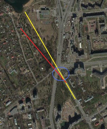 Извините за некорректность. Но на фотографиях видна именно точка (выхода Старопарголовского на Поклонную, ткскть "устье"), а не направление его оси.