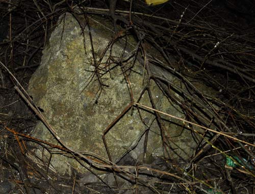 В общем, нет, не удалось. Видимый на фотографии верхний слой бетона под будкой — свеженький; это основание будки. Камни и на холме и рядом я внимательно осмотрел, и пришел к выводу, что к фортификации они отношения не имеют. Это остатки фундамента и стен бывшей недалеко старой бензоколонки, а также куски старого поребрика. Асфальт — оттуда же. Все это валяется и рядом с холмом и на нем. Появились, очевидно, во время строительства новой бензоколонки и станции автосервиса, что рядом с ней.