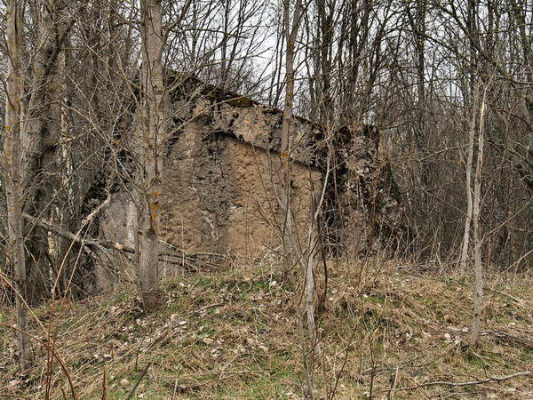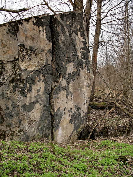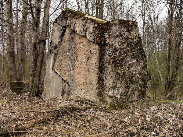 Обращена в сторону заросшего поля, вокруг - лиственный лес. Стоит на небольшом земляном возвышении. Других подобных обломков рядом нет.