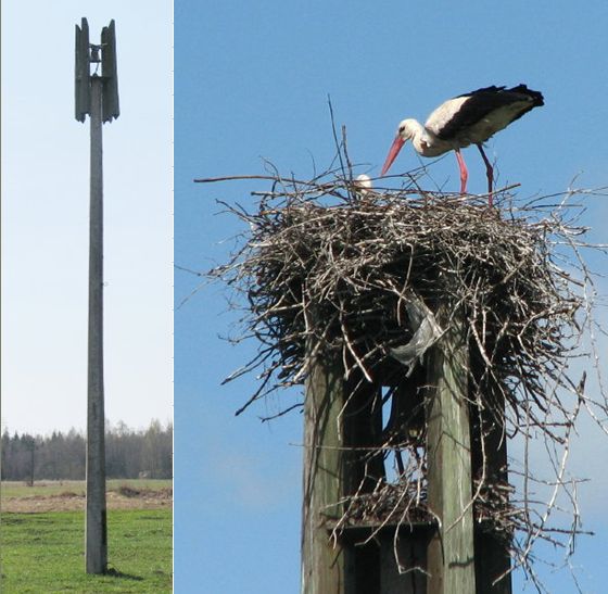 В прошлом году пара аистов поселилась в центре мемориального комплекса «Большое Заречье» Волосовского района, свив гнездо на небольшой деревянной звоннице с поминальным колоколом, венчающей высокий железобетонный столб. (На снимке слева – в 2009 году гнезда ещё не было).