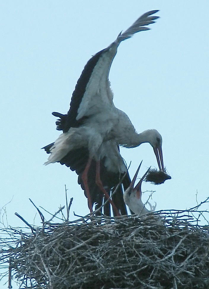 А вот и самка прилетела, с пучком зелени в клюве. Аисты – птицы плотоядные, питаются, в основном, мышами, лягушками, змеями и прочей живностью, так что трава, возможно, предназначалась для отделки гнезда – чтобы птенцам было тепло и мягко.