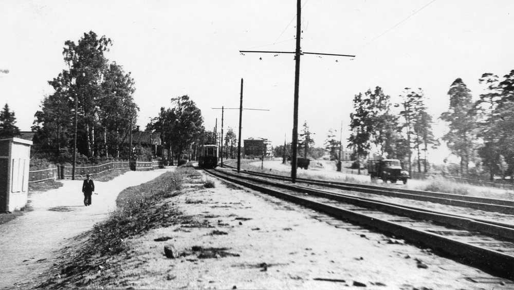 Трамвайные пути-справа.За автобусом сохранившееся здание с адресом Выборгское шоссе дом 34.Бывшая школа
