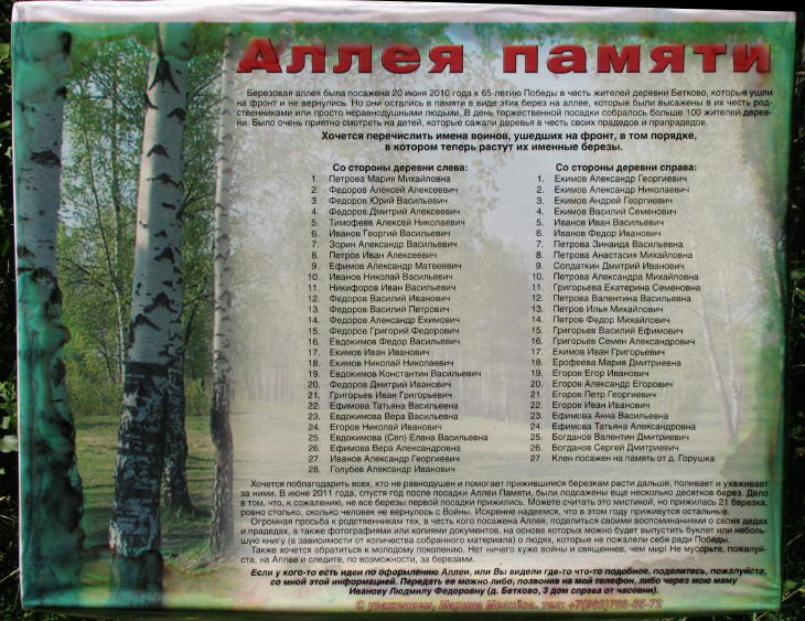 В деревне Бетково, на шоссе Луга-Оредеж, память о земляках, ушедших на фронт, и погибших, и вернувшихся, увековечили в виде Аллеи памяти, посадив в честь каждого из них "именную" берёзку.
