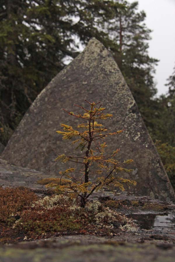 Здесь лес был красив: сосны, белый мох и вереск. Немного пройдя по тропе обнаружили еще один жертвенный камень, формой напоминавший какого-то зверя. Решив, что грифоны не характерны для саамского эпоса, нарекли его койра-киви (собака-камень), в честь Рыжей Лайки.