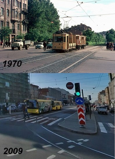 Сопоставляя фото 1970 г. и современный вид, получается, видимо, что остановка была не на самом углу с Кузнечным, как сейчас, а немного южнее, примерно вот тут- http://maps.yandex.ru/-/CBq5F6NT Либо же, если считать что остановка никуда не "переезжала", то видимо оптика искажает и по-разному передаёт "удаленность" домов, т.к. они кажутся гораздо дальше чем на фото 1970 г.- http://maps.yandex.ru/-/CBq5FG1x.