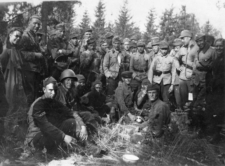 Затем около недели мы двигались по лесу, постоянно вступая в перестрелки с противником. Это были очень тяжелые дни, которые сильно подкосили наши силы. Питались мы в основном черникой и голубикой, которая росла в лесу. Чтобы легче было двигаться, побросали шинели, освободились от лишнего снаряжения, оставив себе только боевое оружие. Потом наступили холодные осенние ночи, во время которых мы начали сильно замерзать. Одним словом, тяжелый марш по лесисто-болотистой местности, голод, холод вымотали наших бойцов до предела. Запомнился мне даже такой случай. Один низкорослый боец по фамилии Воробьев свалился на землю, после чего нам демонстративно заявил: «Все, дальше идти не могу, останусь здесь. Финны не звери, не убьют.» Мы еле уговорили его подняться с земли и сами понесли его карабин. Он пошел в нашей общей колонне, и благодаря этому сохранил себе жизнь.