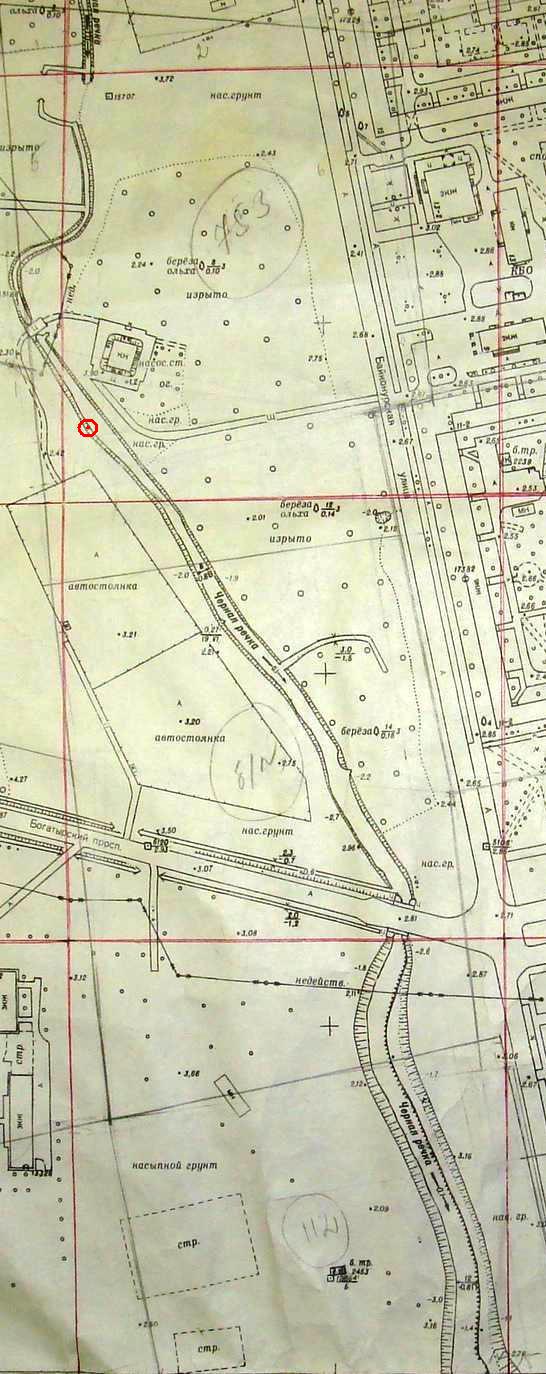Фиолетовой линией обозначил канаву,которую прокопали вдоль Богатырского и вывели в Чёрную Речку у Богатырского моста, правда я не разбирался пока, откуда идёт эта канава и зачем она вообще была вырыта (есть дурацкое предположение,что для подпитки Чёрной Речки водой)