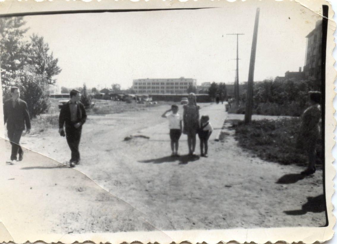 Снимок сделан в 1965-1966 гг. На переднем плане начало тротуара Хлопина 7-1, который теперь посередине проезжей части. Вдали видна полоса гаражей и новый дом агрофизического института, который теперь отдан под жилье и сильно перестроен.